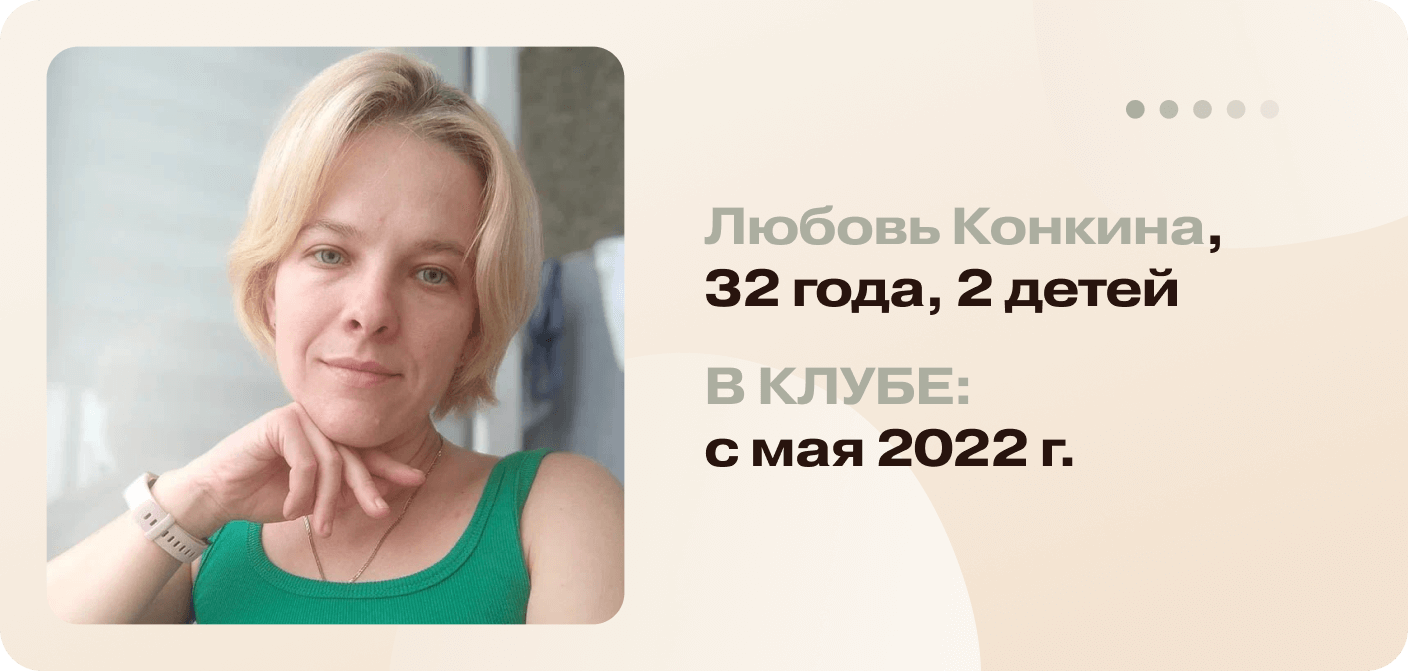 Любовь пришла в КЛУБ8.30 в мае 2022, чтобы подтянуть живот и убрать галифе. А ещё тяготил вес: 73 кг, которые хотелось превратить в приятные 55.